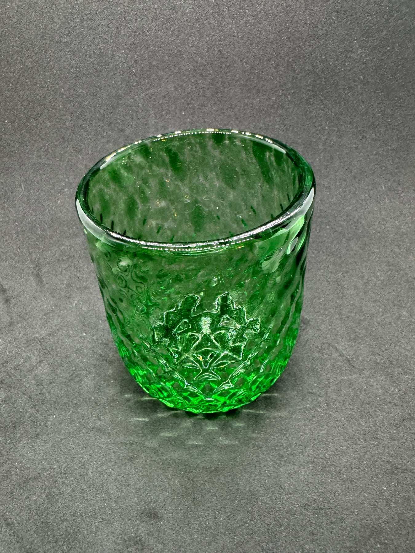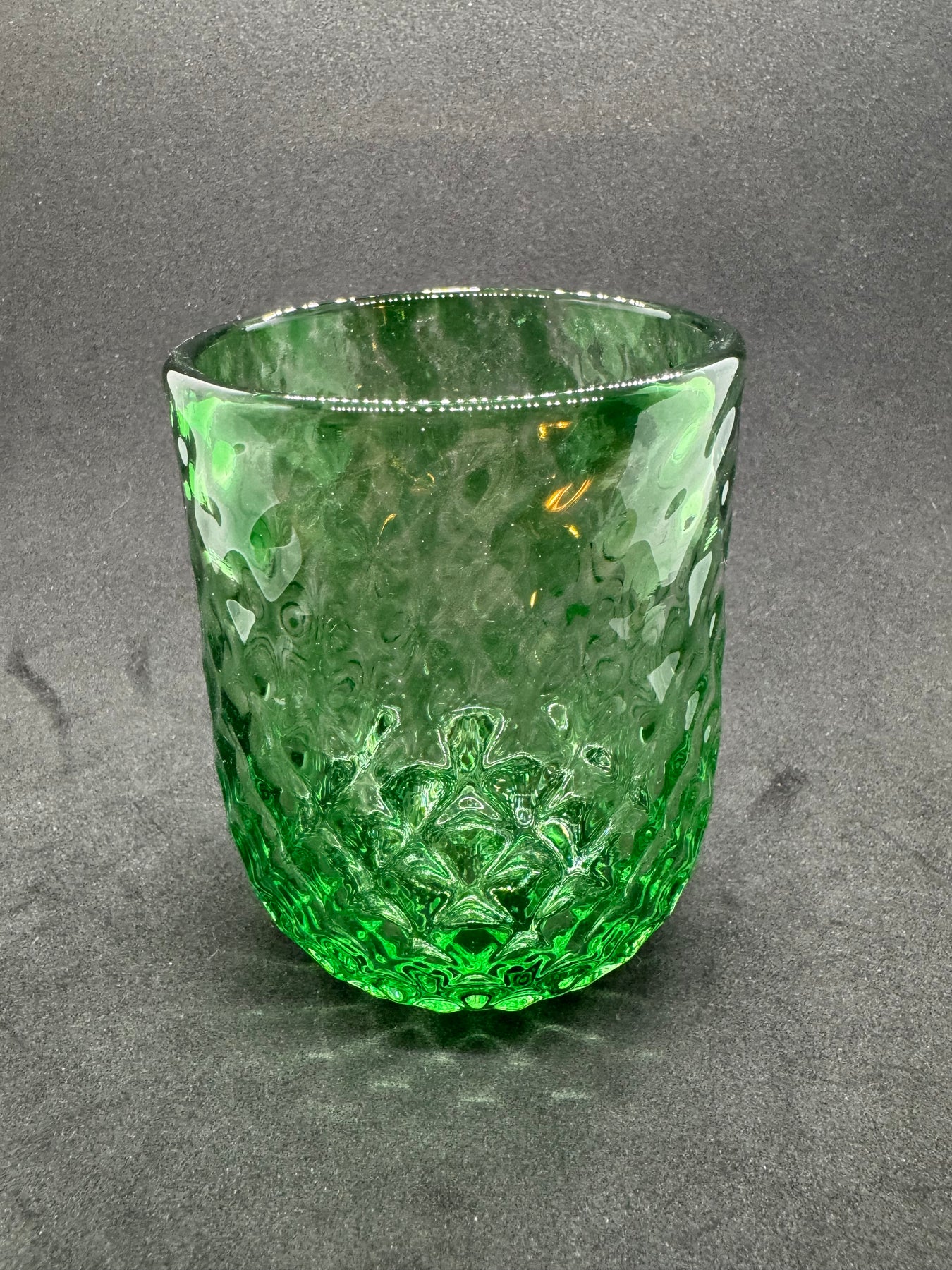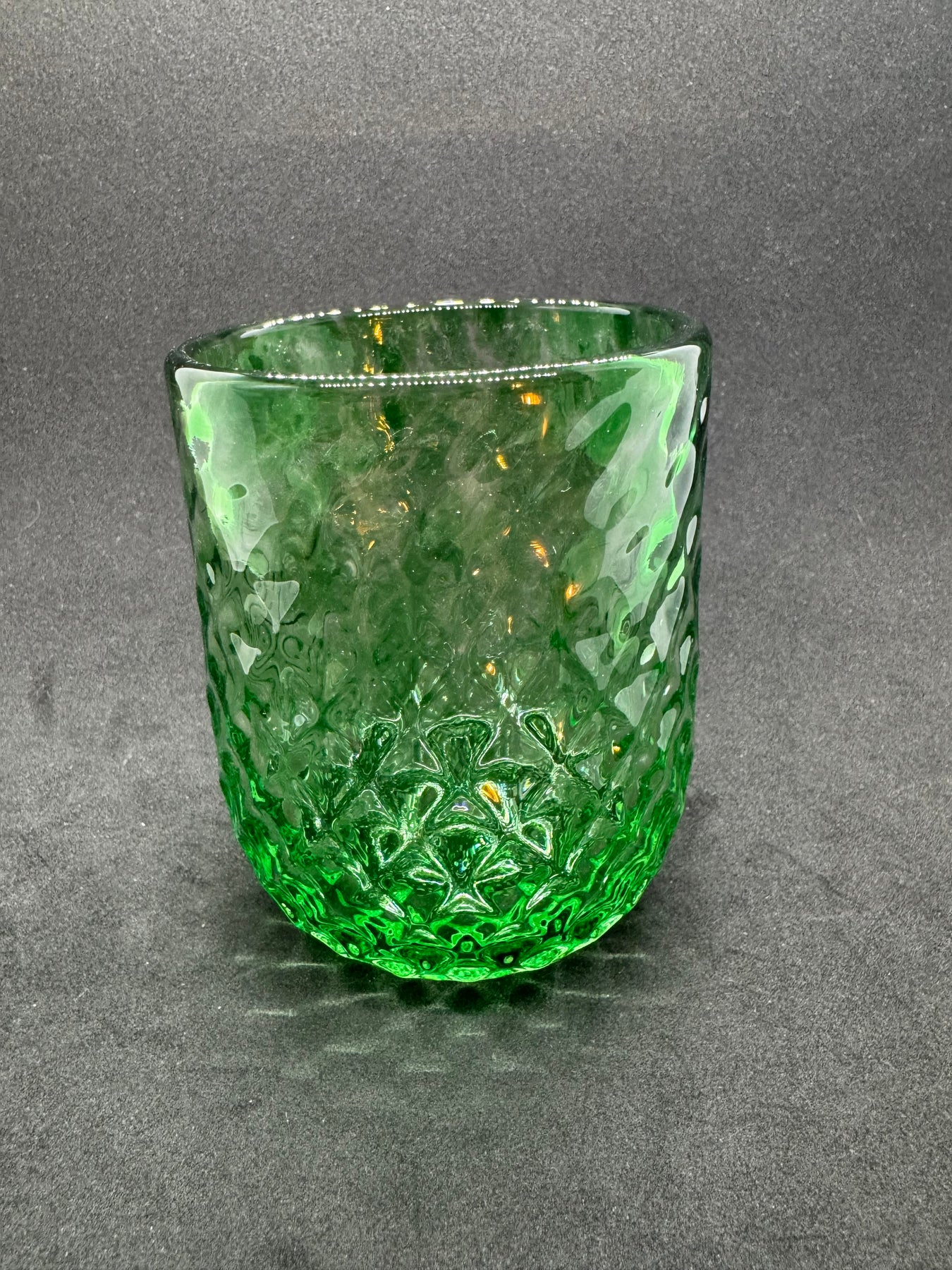 Hand blown glass cup in green color with diamond faceted pattern. This beautiful glass cup is one of a kind and made utilizing the infamous pineapple mold to give the glass its gorgeous texture. ~4”