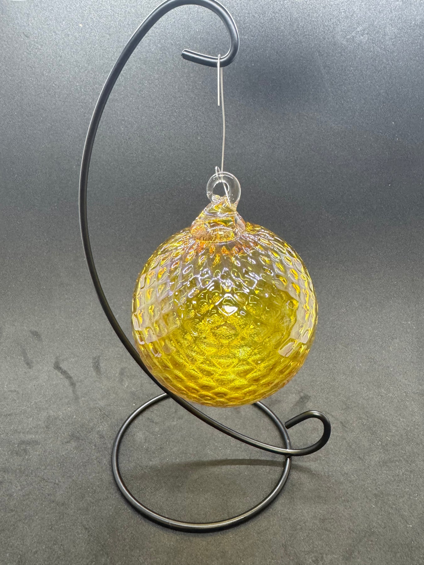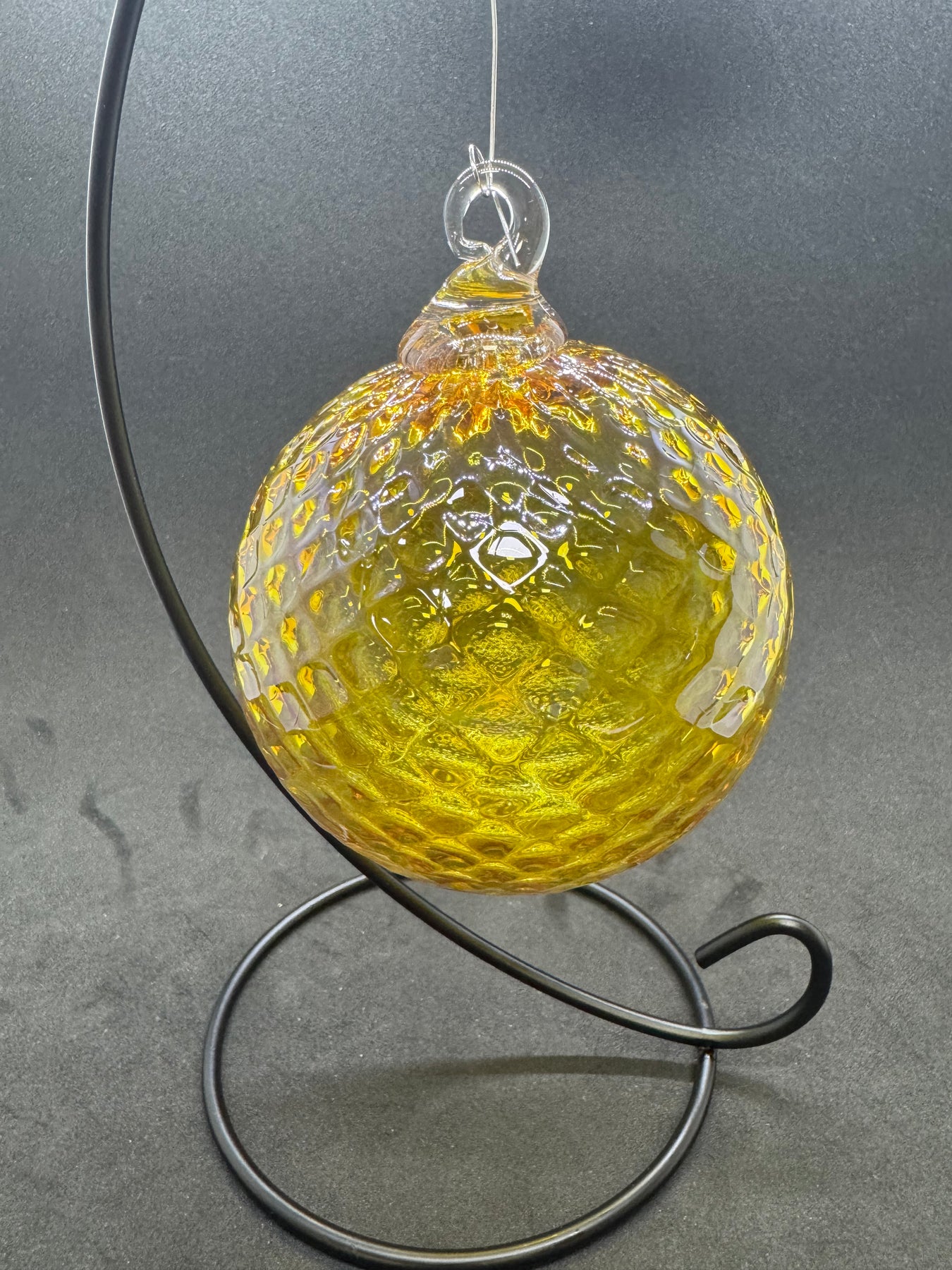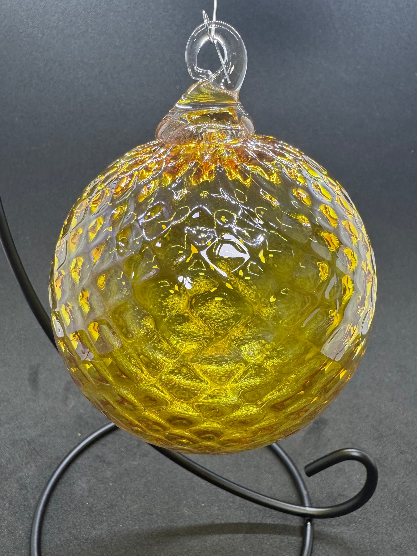 These vintage glass ornaments are the signature of our studio! The diamond texture creates beautiful facets of light on this gold topaz bauble. This fancy glass ornament makes the perfect gift over the holidays! ~ 2.5” - 3.5”. (Stand not included)