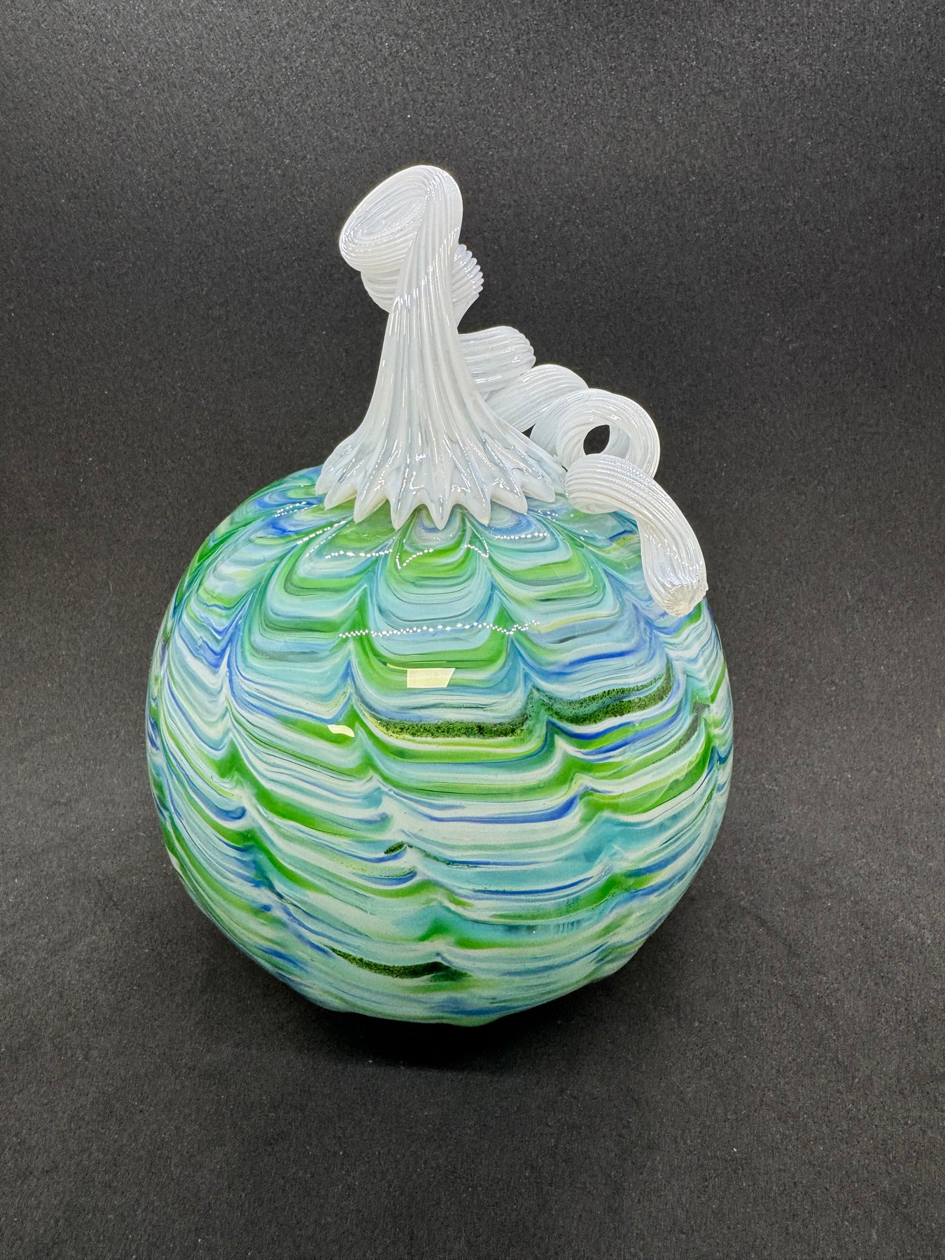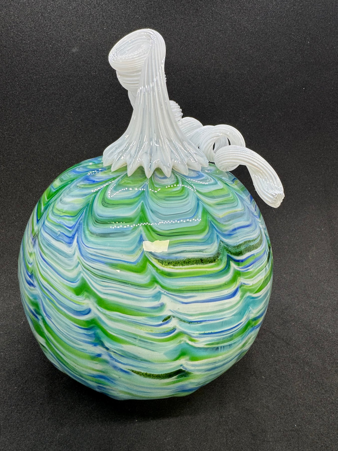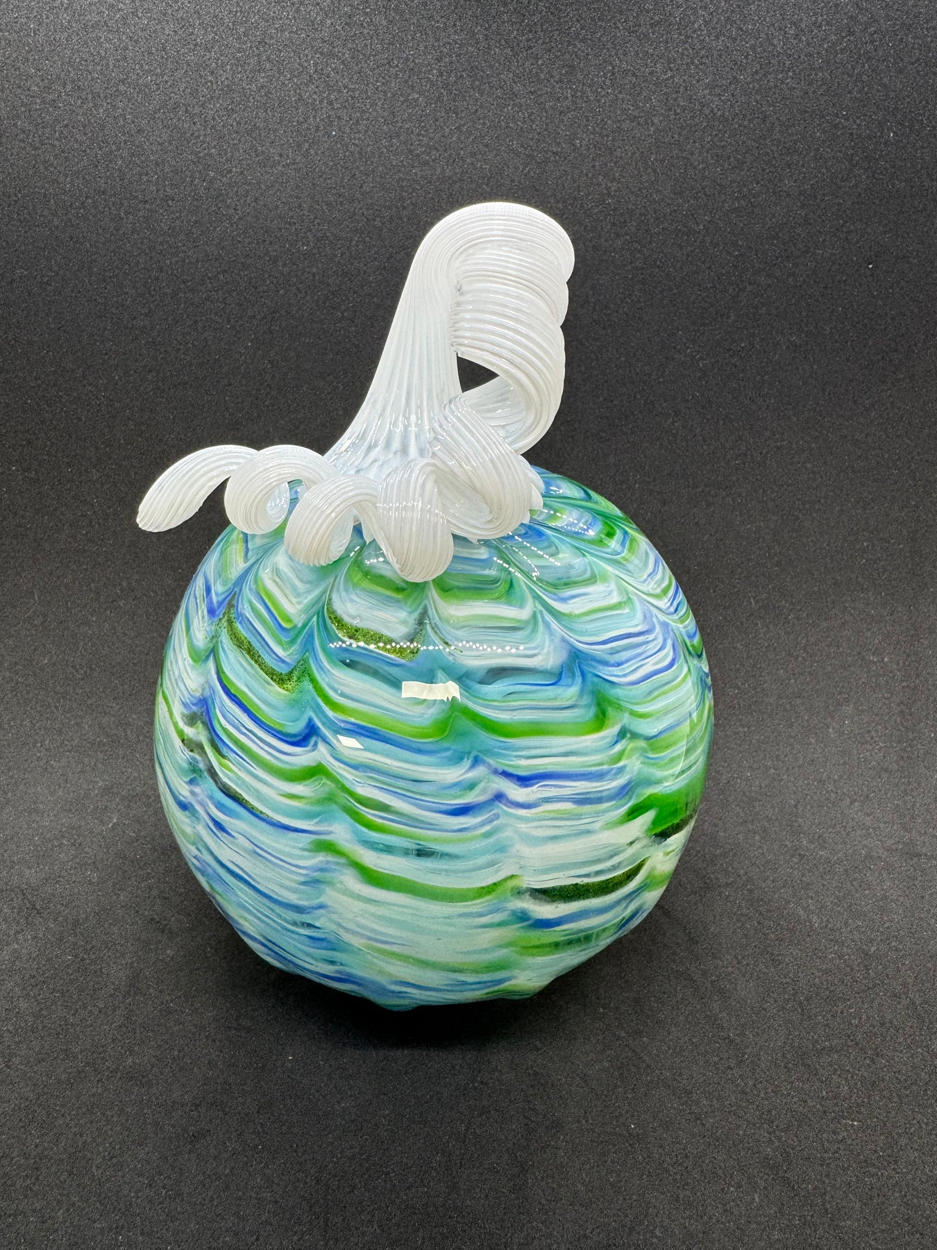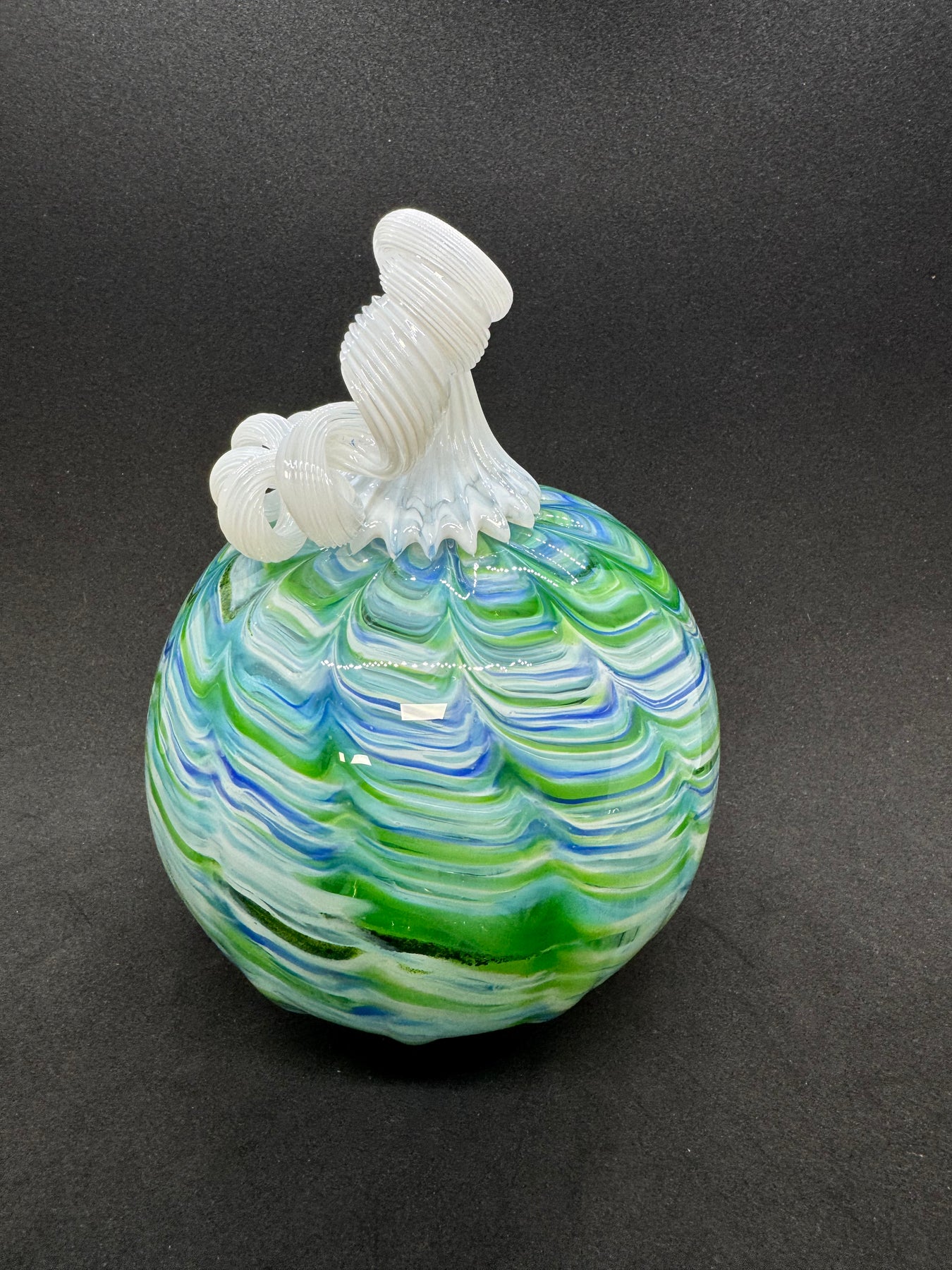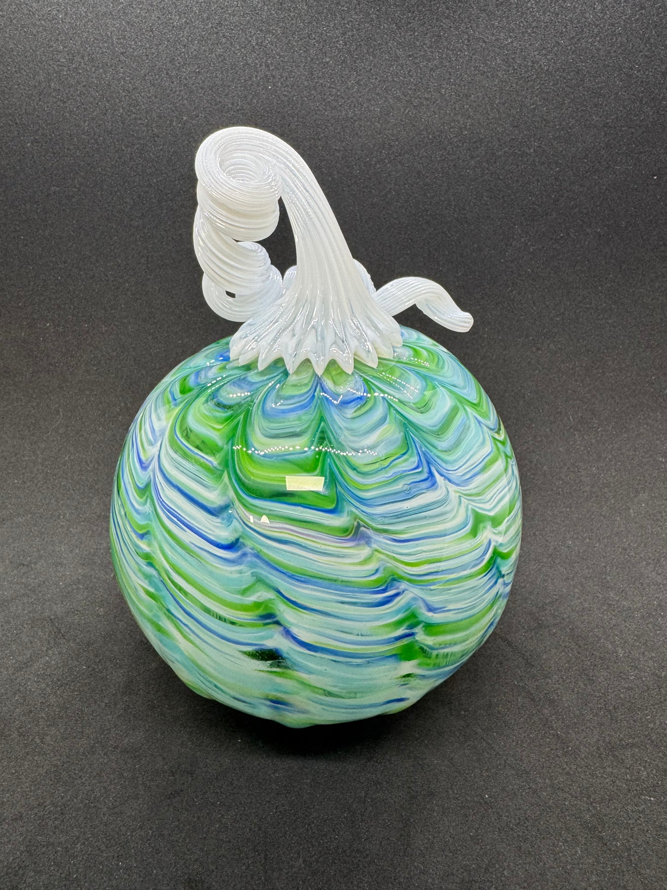Larger Blue Green Glass Pumpkin made with Sam’s signature Suminagashi style pattern. This handblown glass pumpkin is one of a kind and made using ancient Venetian glassblowing techniques and tools. A unique glass pumpkin makes a perfect paperweight, shelf art or gift for any time of year.