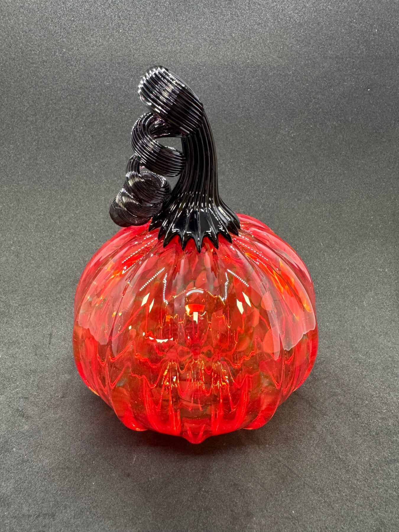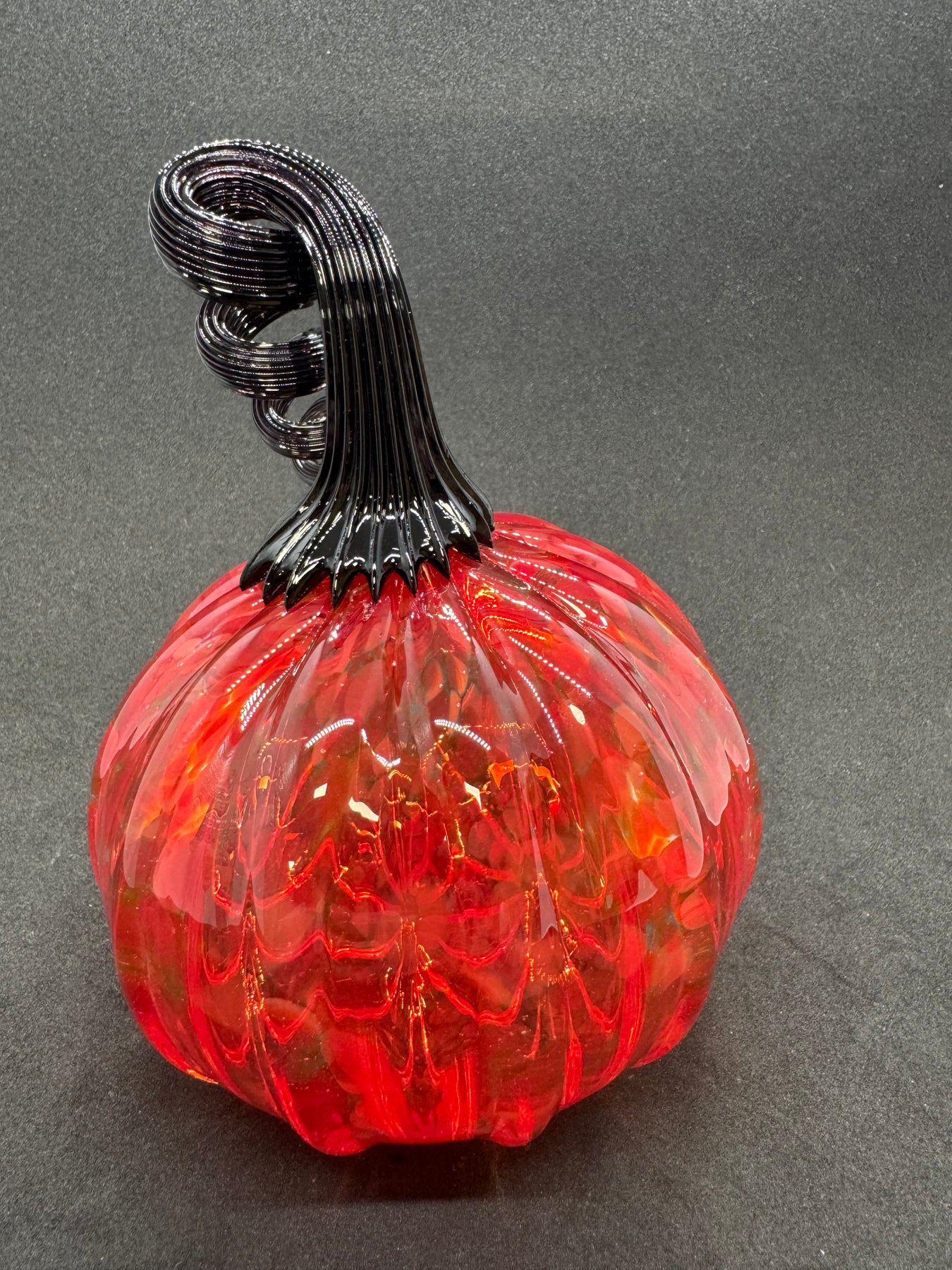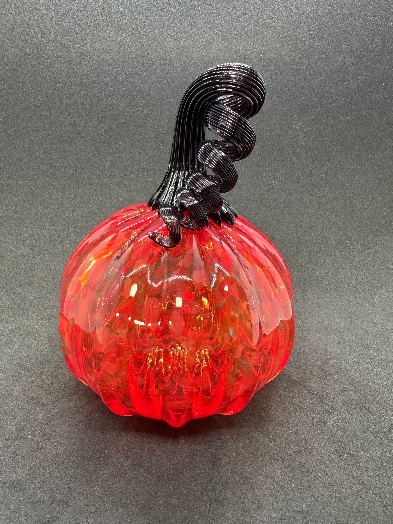 Hand blown glass pumpkin in bright red and dark black stem for the UGA Bulldogs. This handblown glass pumpkin is one of a kind and made using ancient Venetian glassblowing techniques and tools. A unique glass pumpkin makes a perfect paperweight, shelf art or gift for any time of year.