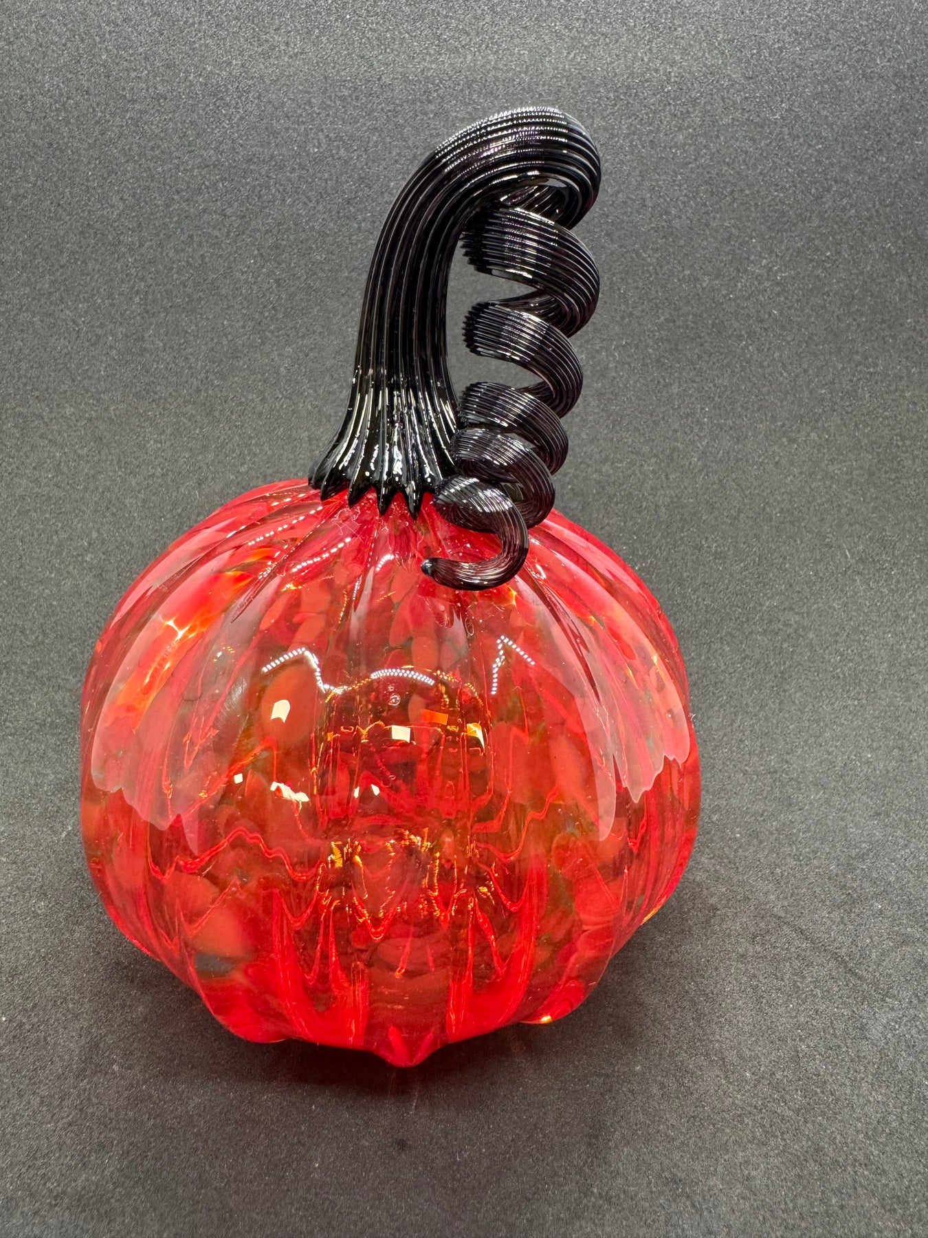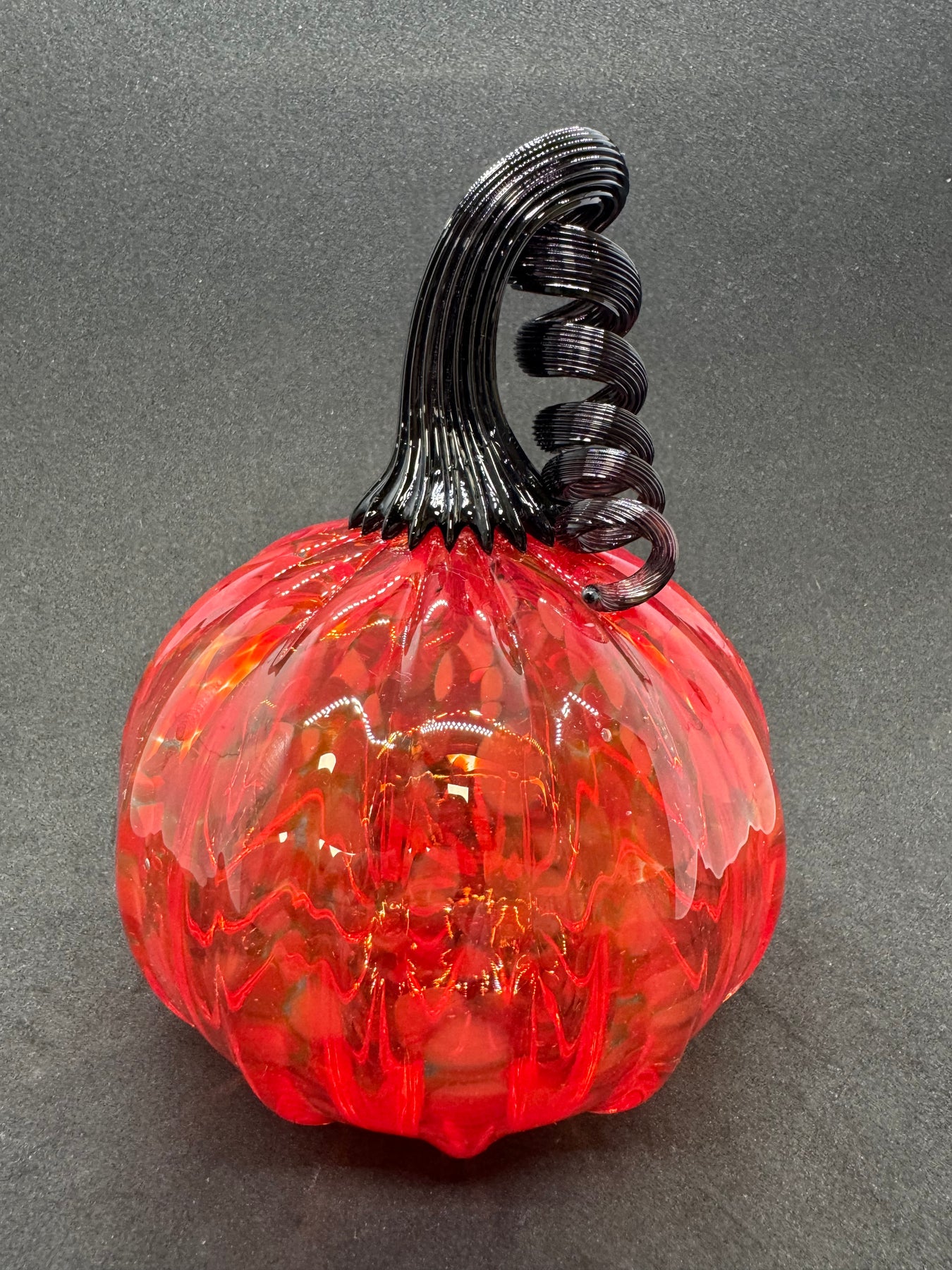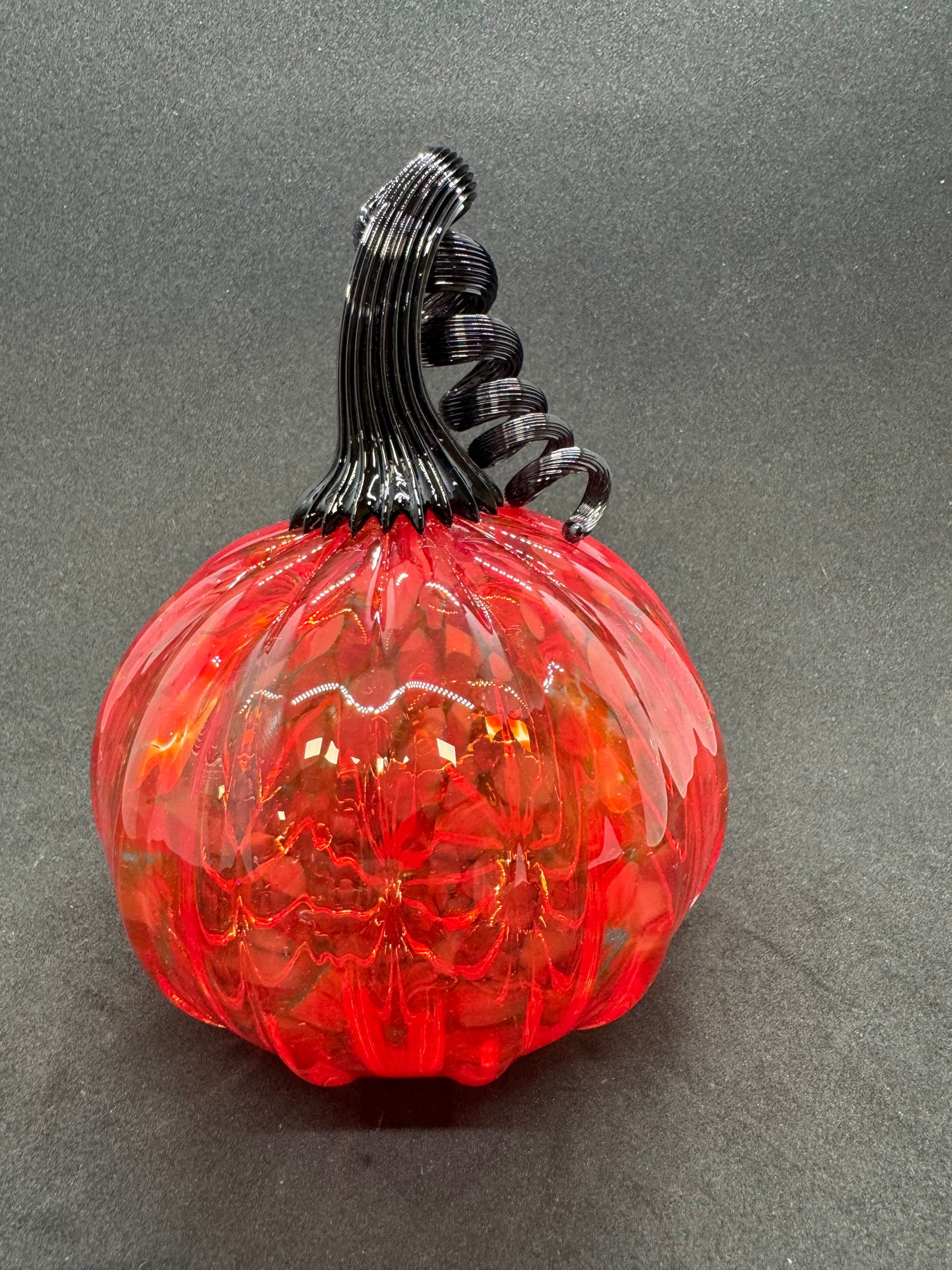 Hand blown glass pumpkin in bright red and dark black stem for the UGA Bulldogs. This handblown glass pumpkin is one of a kind and made using ancient Venetian glassblowing techniques and tools. A unique glass pumpkin makes a perfect paperweight, shelf art or gift for any time of year.
