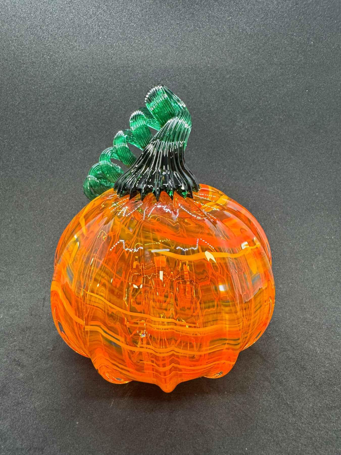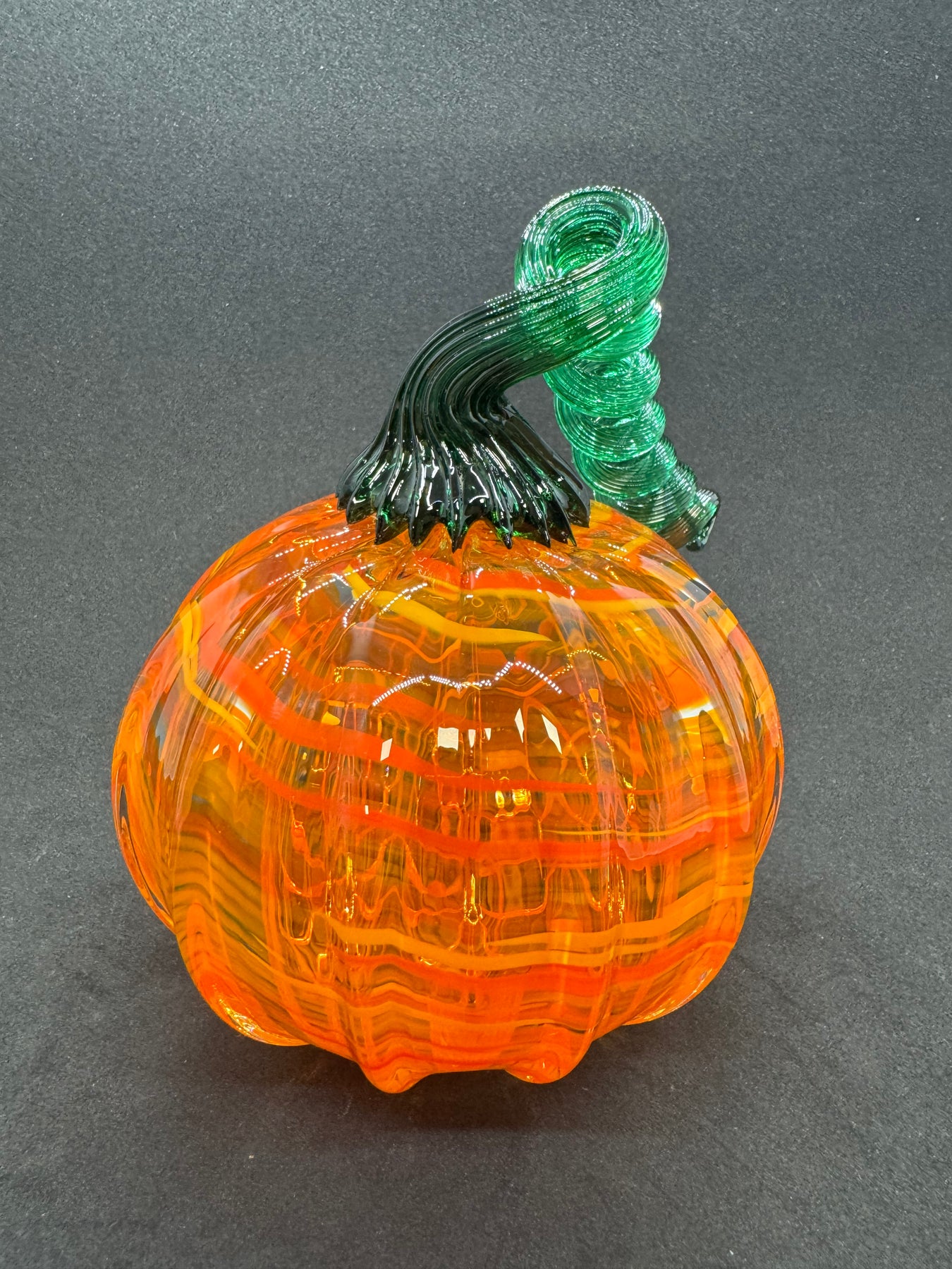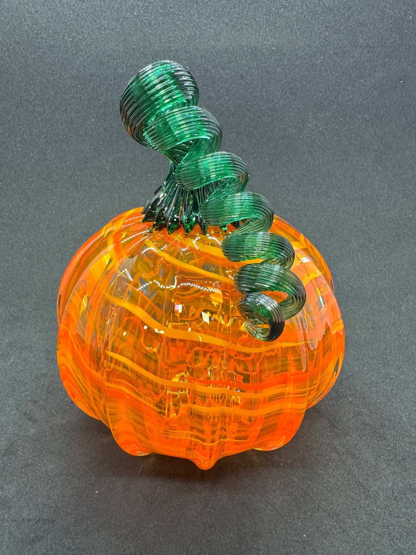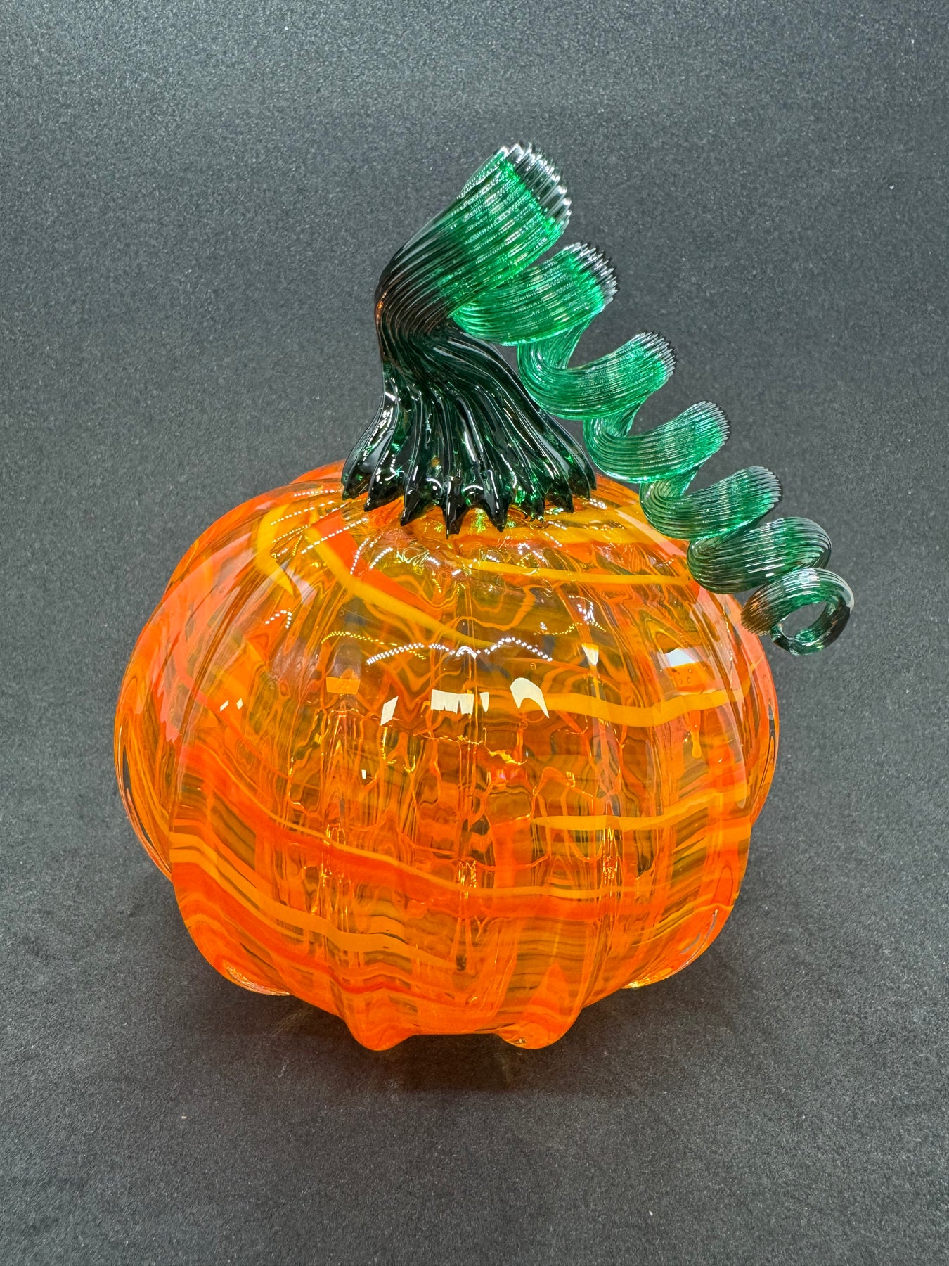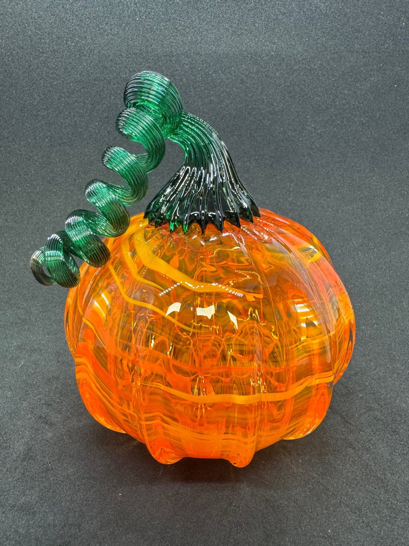 Classic Orange glass pumpkin with emerald green curly stem. This handblown glass pumpkin is one of a kind and made using ancient Venetian glassblowing techniques and tools. A unique glass pumpkin makes a perfect paperweight, shelf art or gift for any time of year.