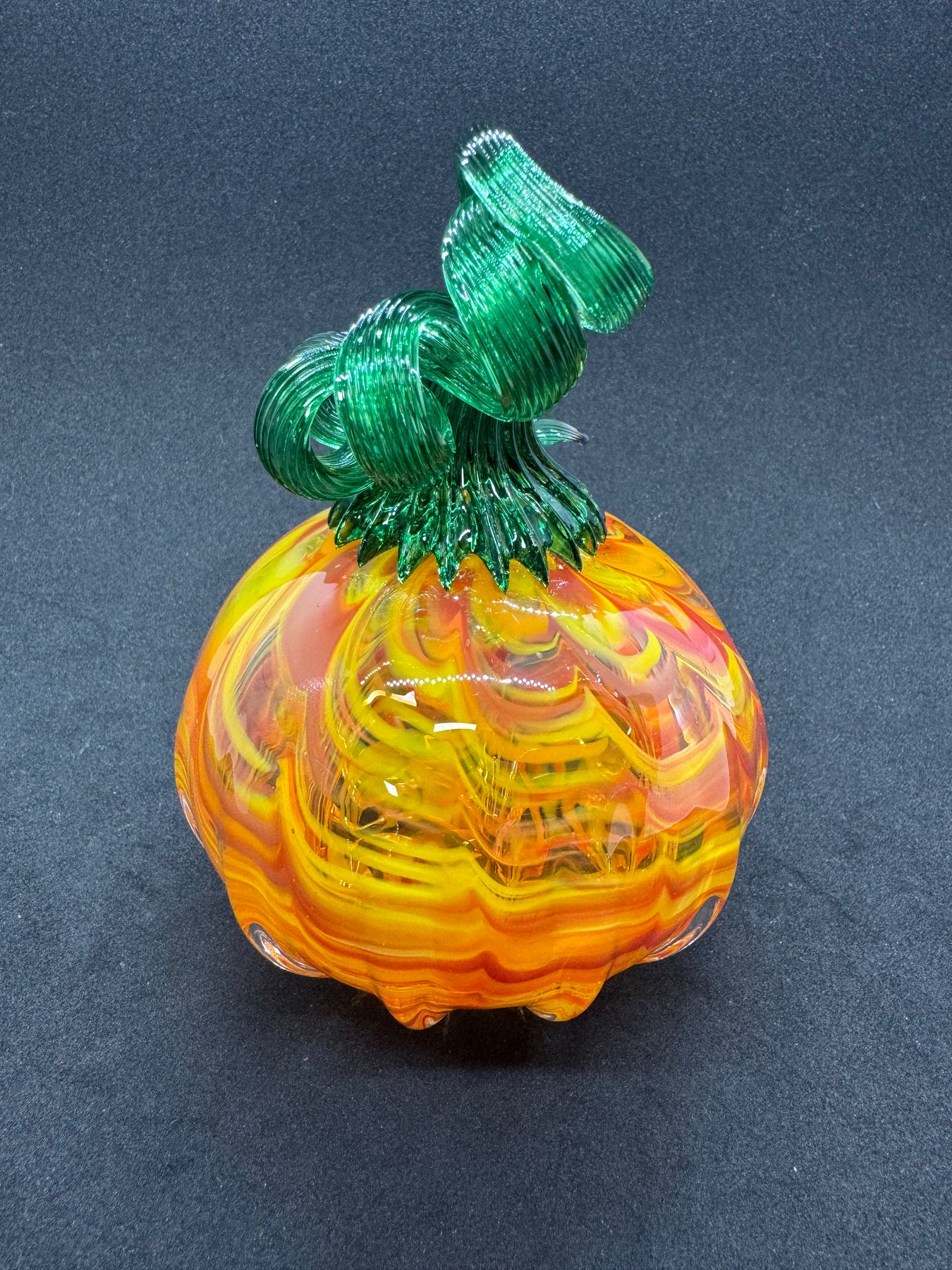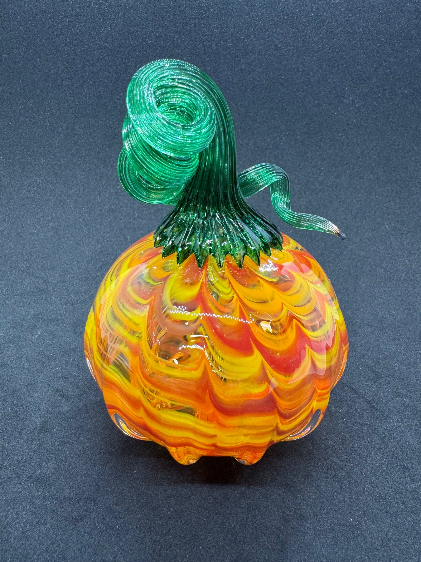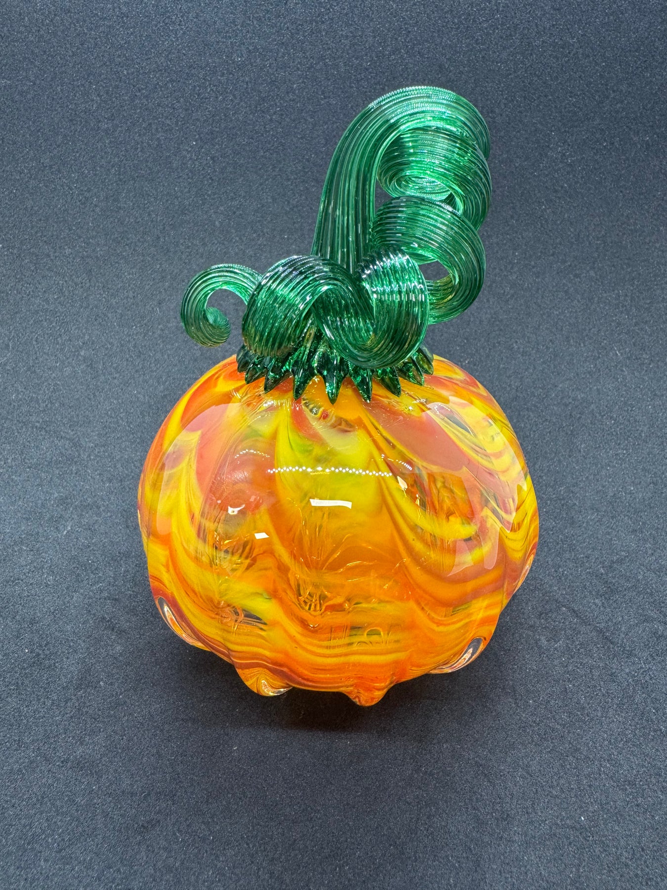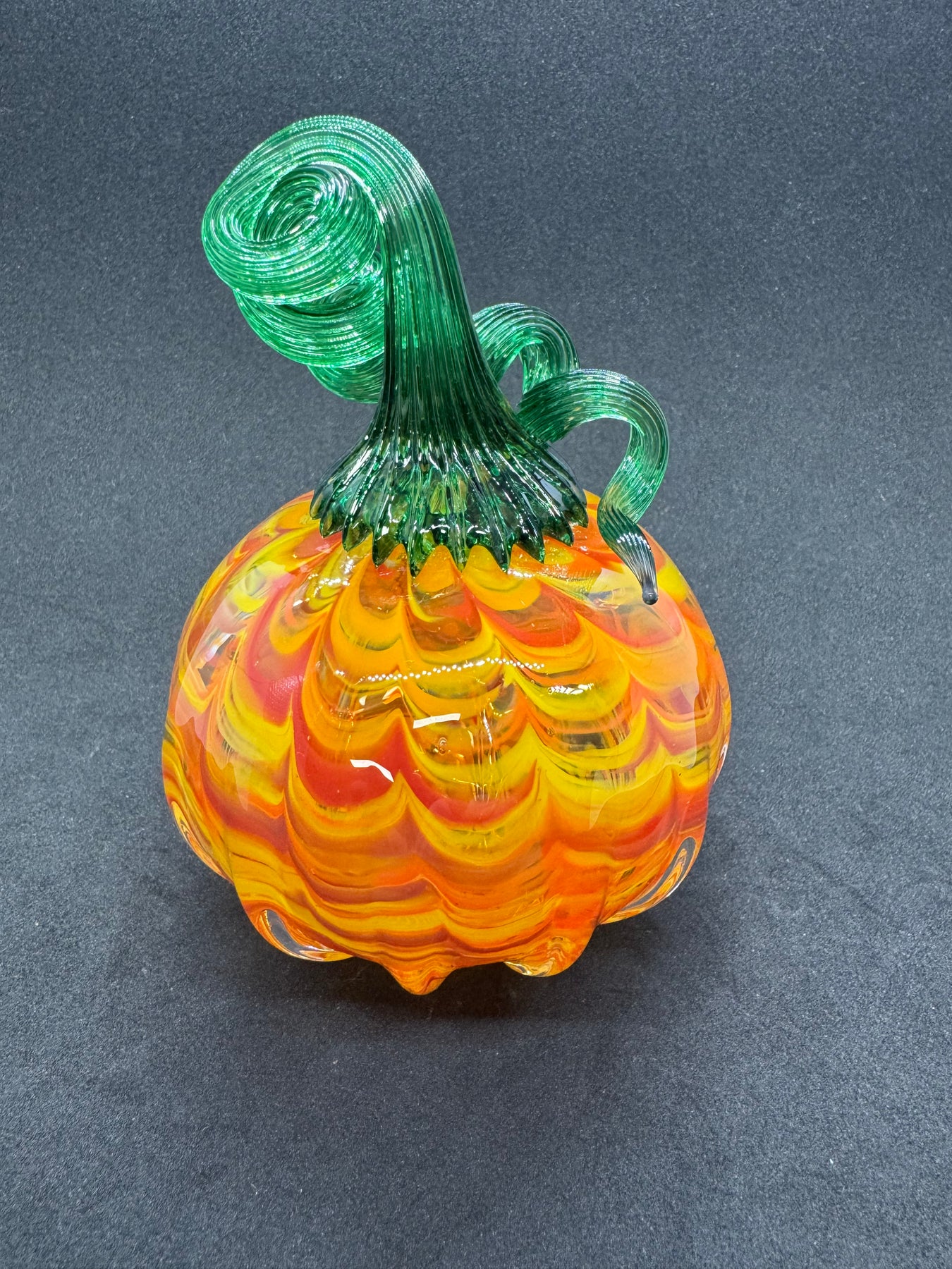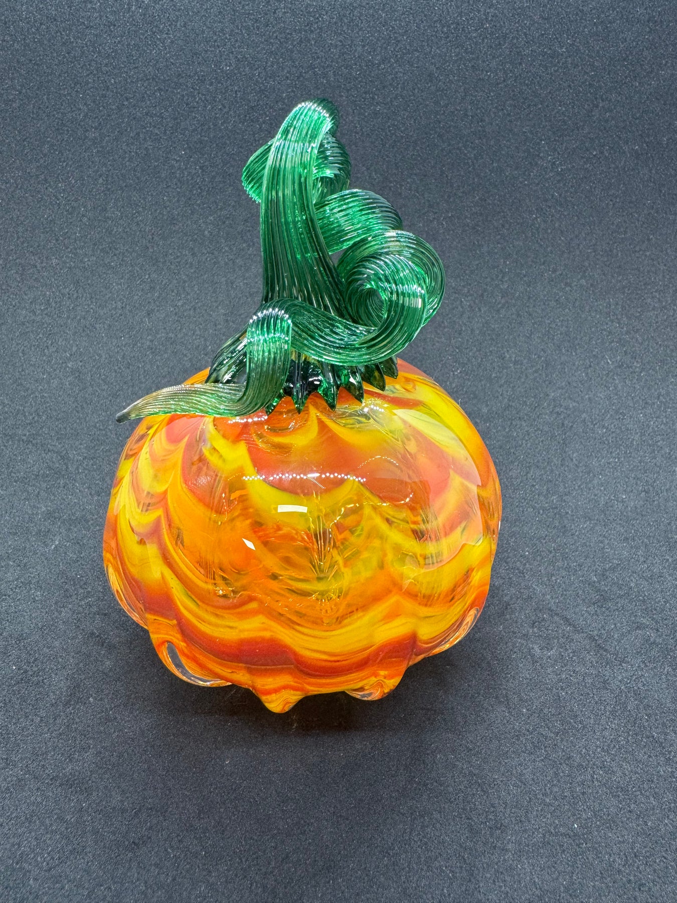 Classic fiery glass pumpkin with green curly stem. This handblown glass pumpkin is one of a kind and made using ancient Venetian glassblowing techniques and tools. A unique glass pumpkin makes a perfect paperweight, shelf art or gift for any time of year.