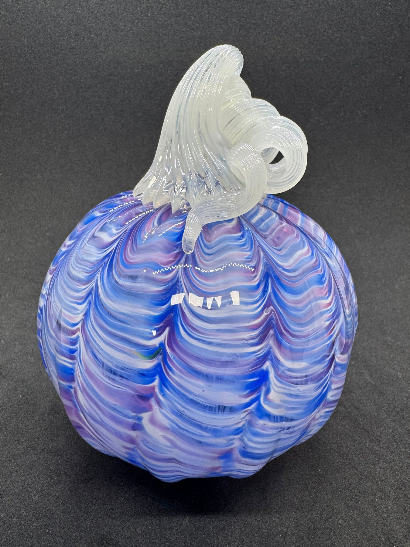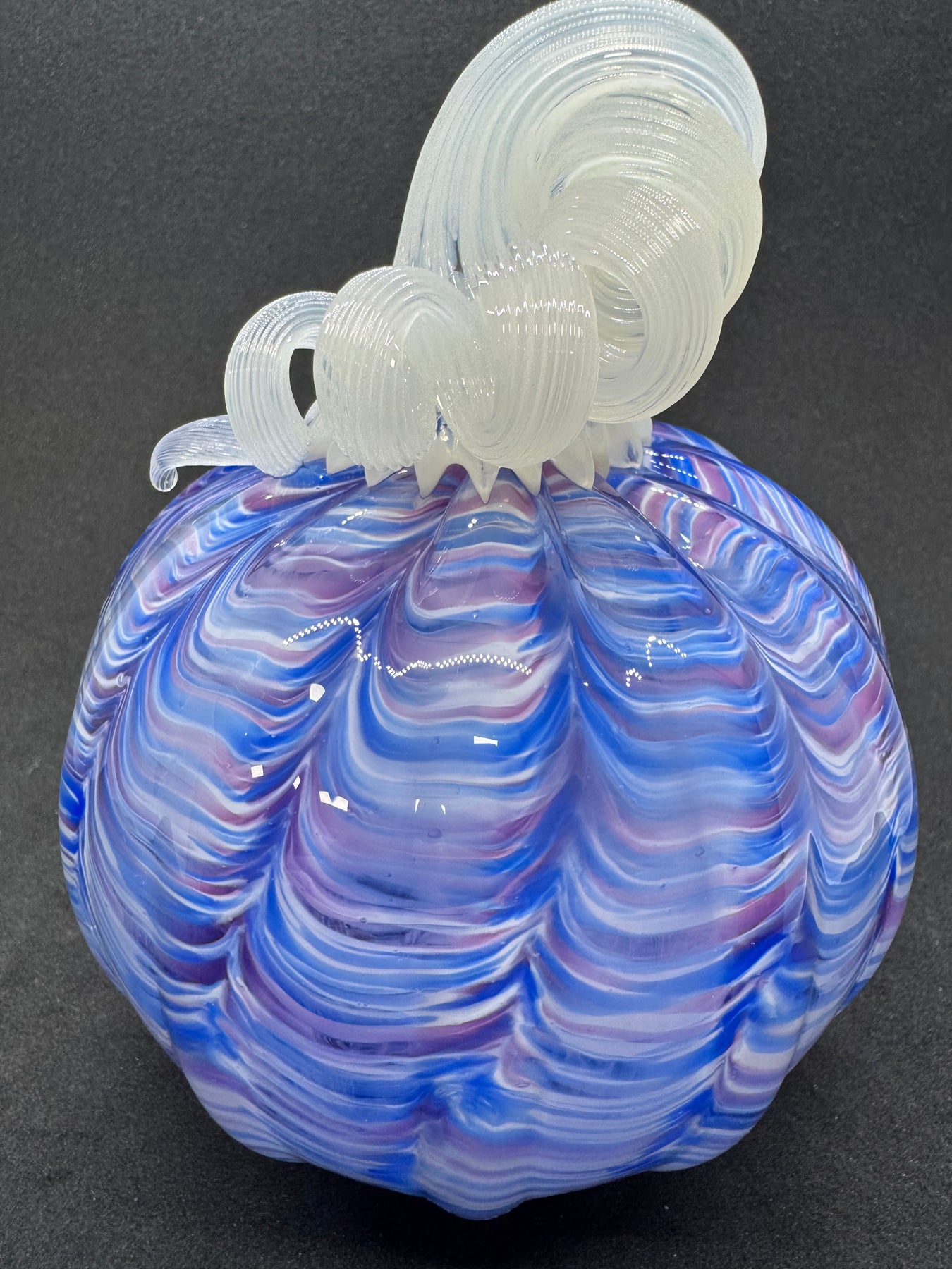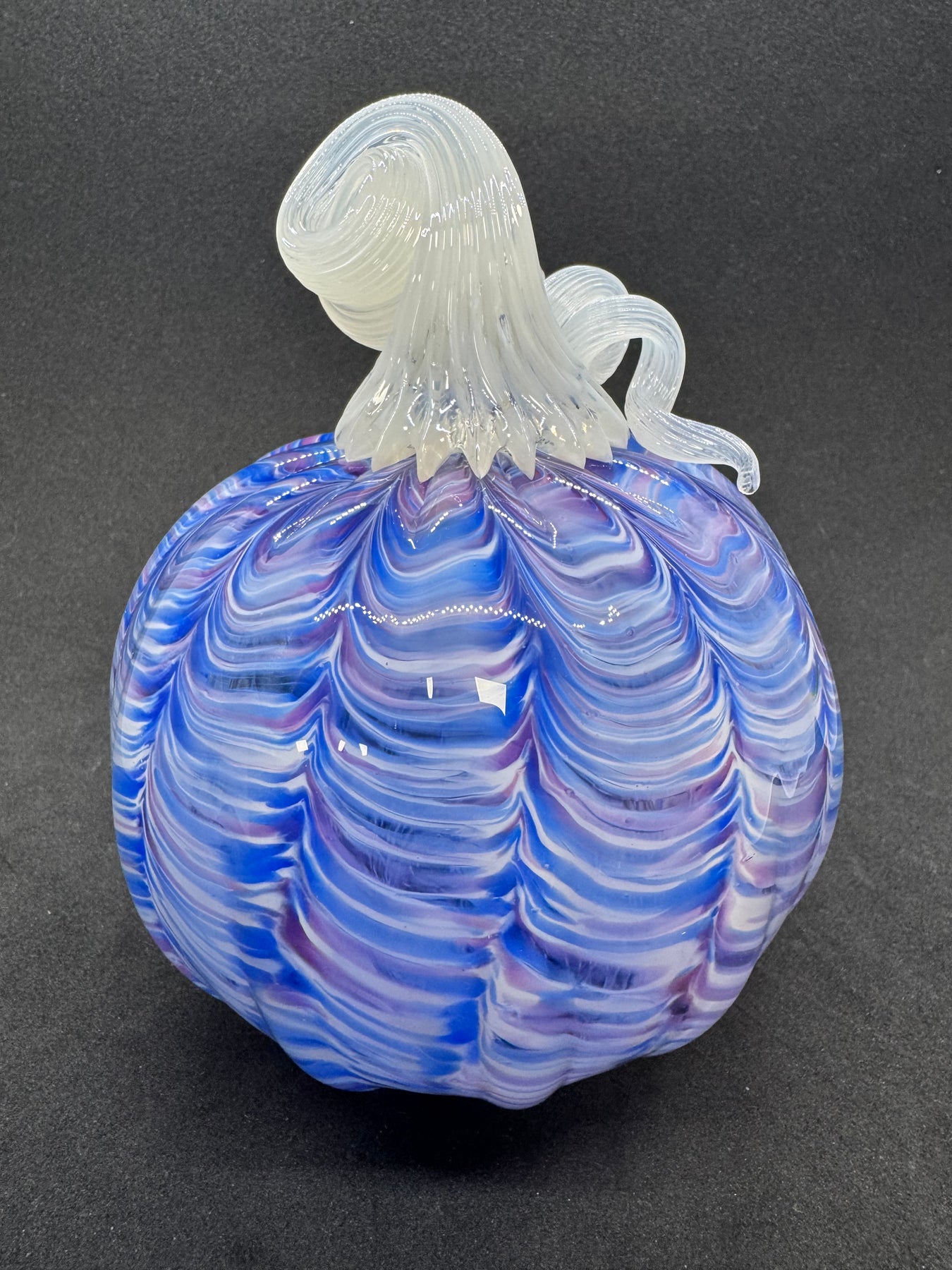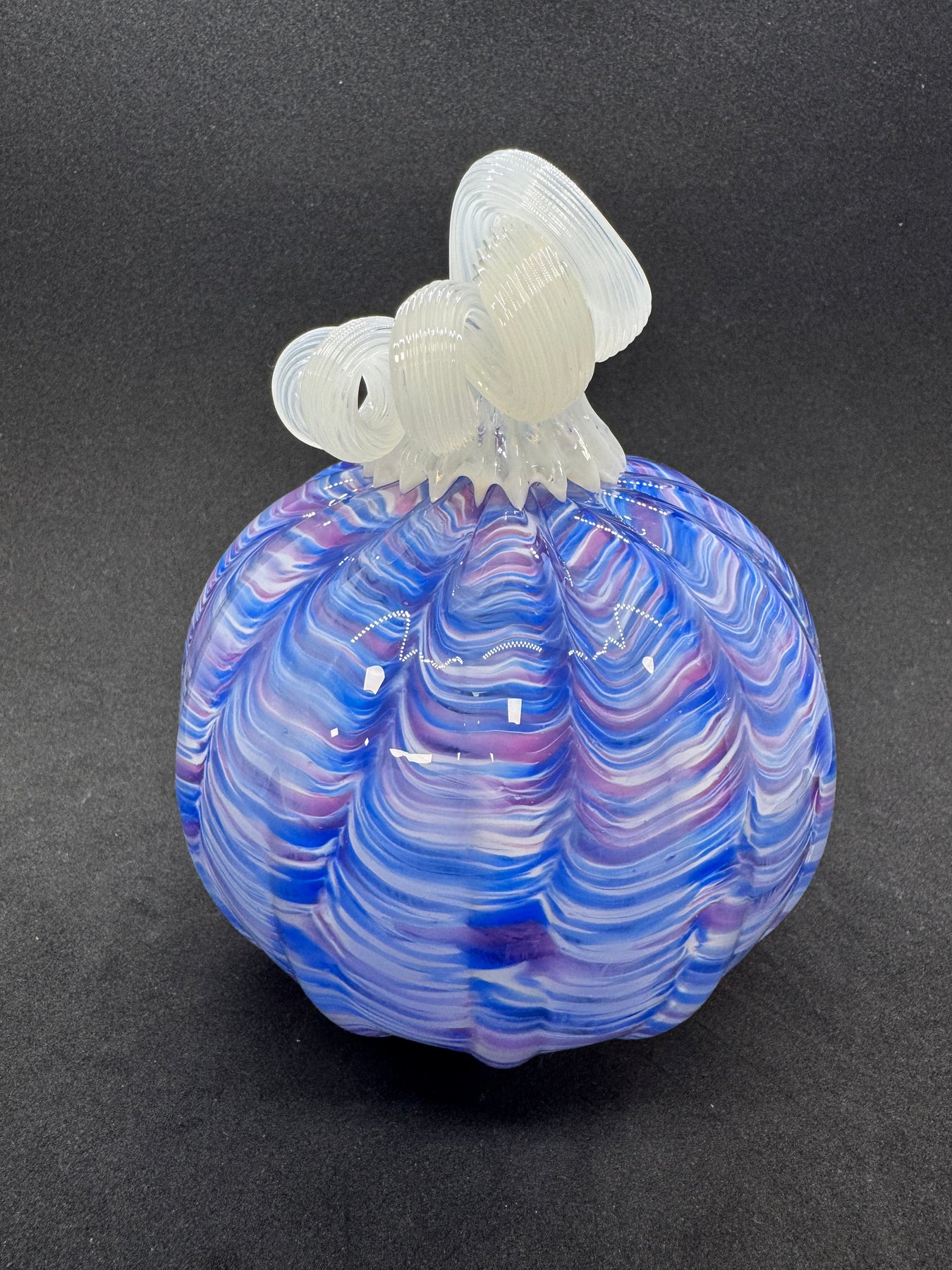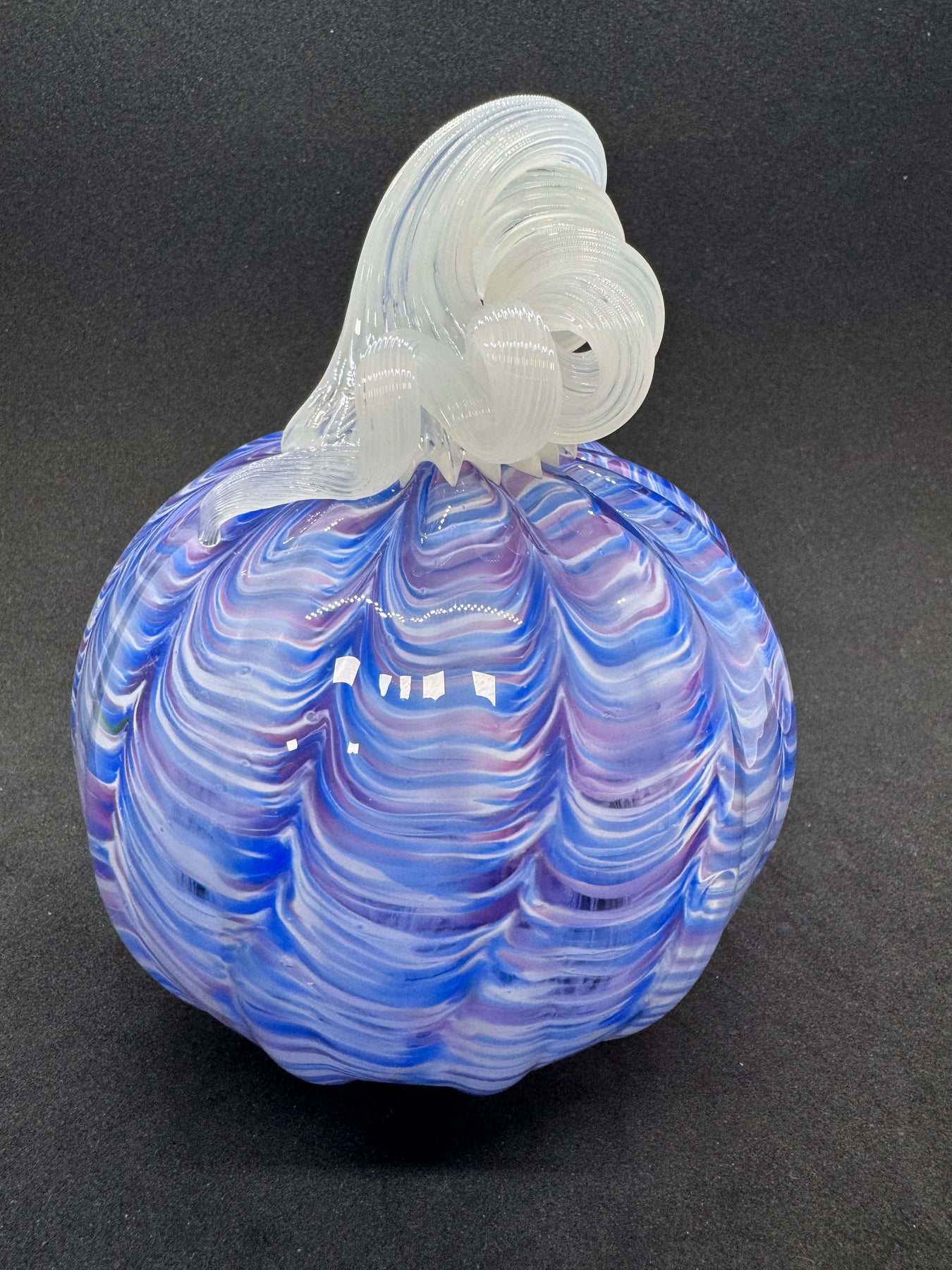Beautiful blue, purple and white glass pumpkin made with Sam’s signature Suminagashi style pattern. This handblown glass pumpkin is one of a kind and made using ancient Venetian glassblowing techniques and tools. A unique glass pumpkin makes a perfect paperweight, shelf art or gift for any time of year.