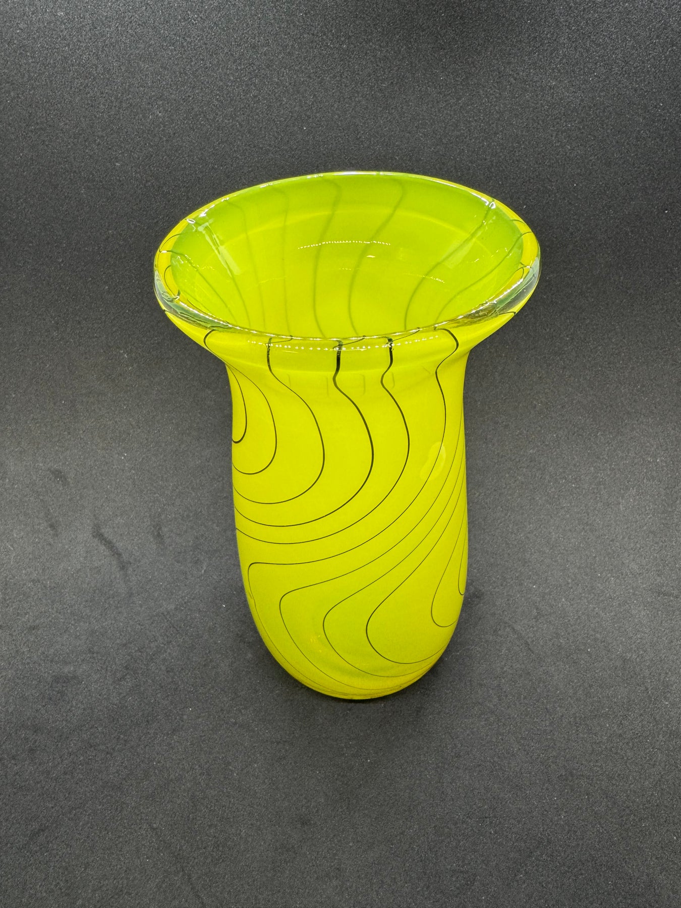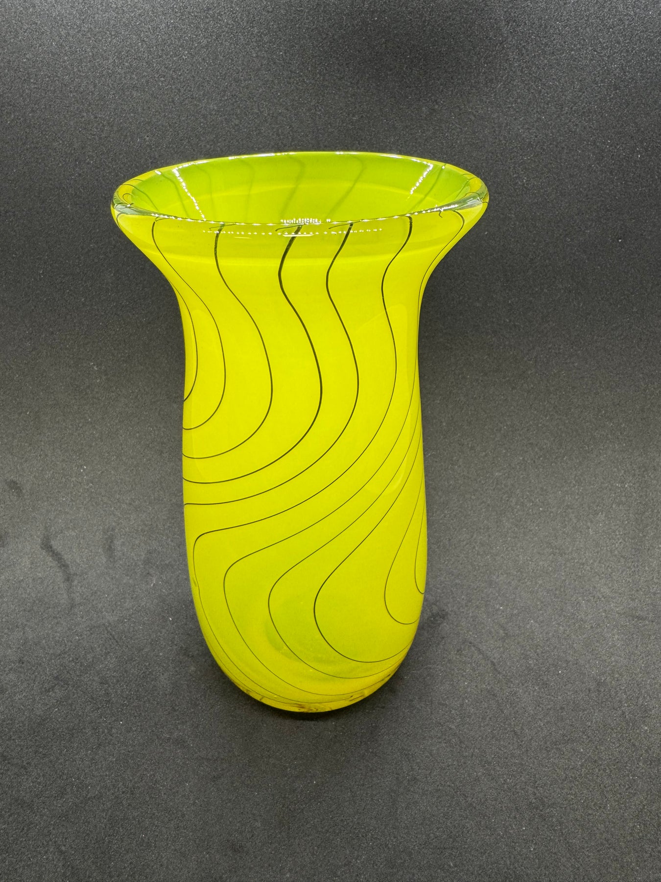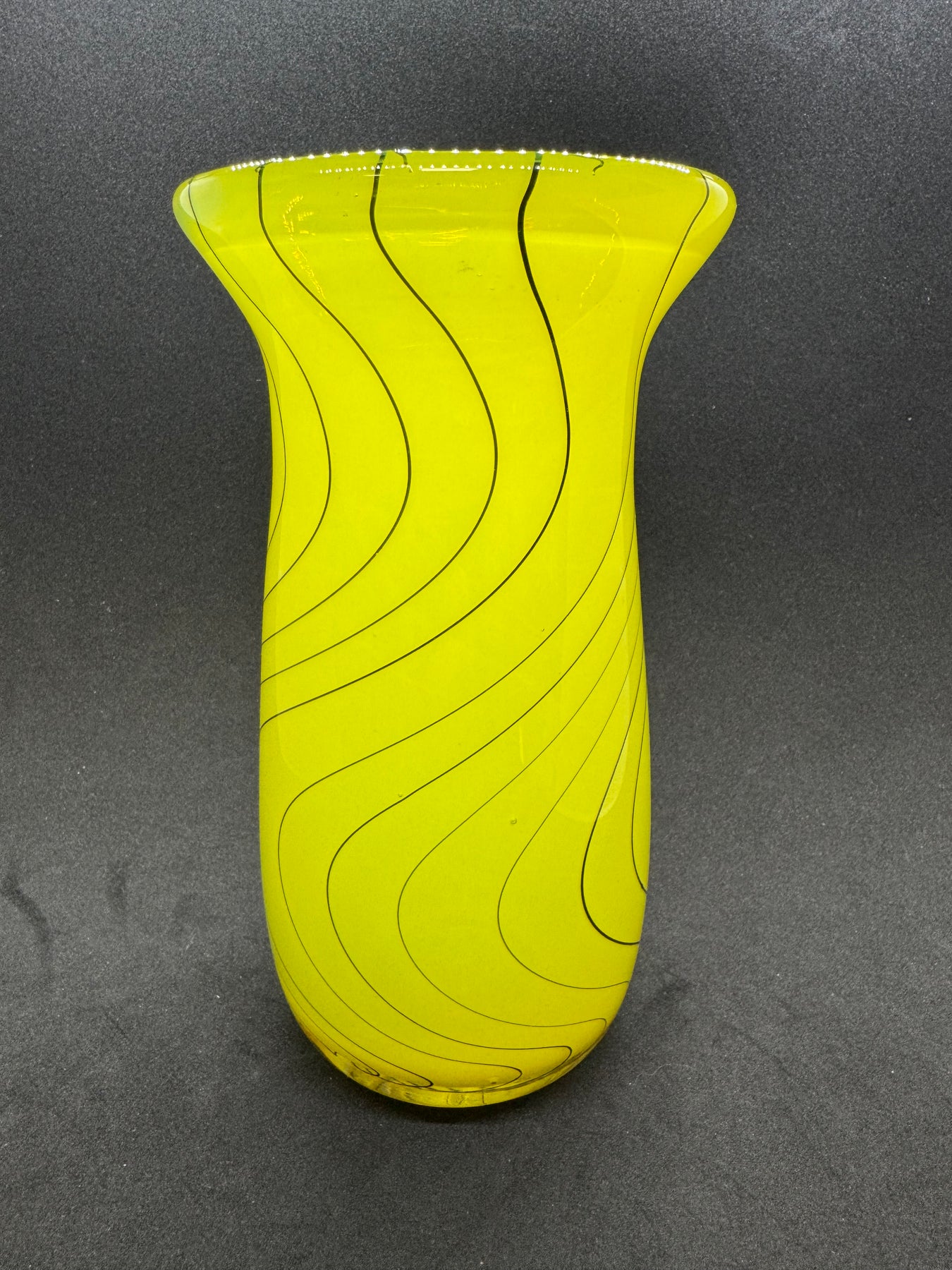 Large hand blown glass vase, yellow with hand pulled black cane in a wig wag pattern. ~ 7.5” x 3”