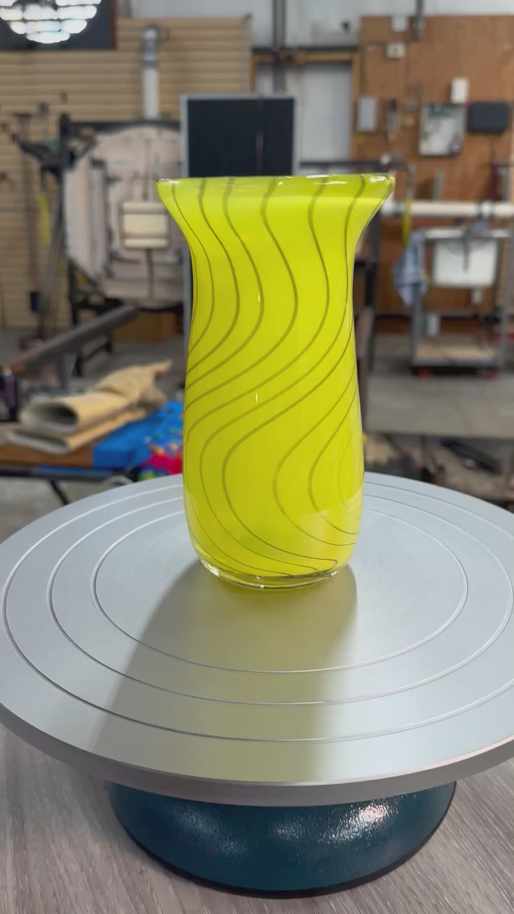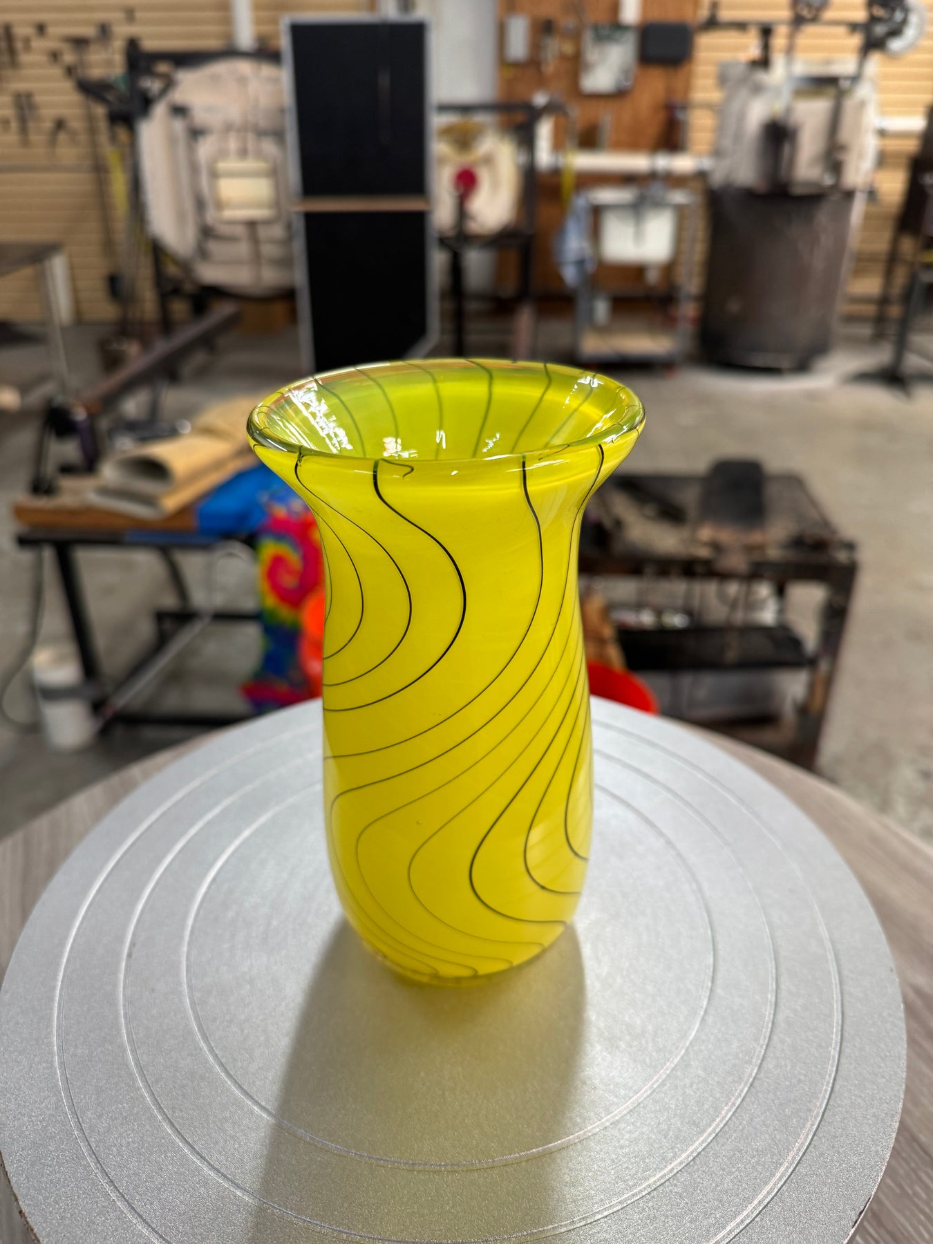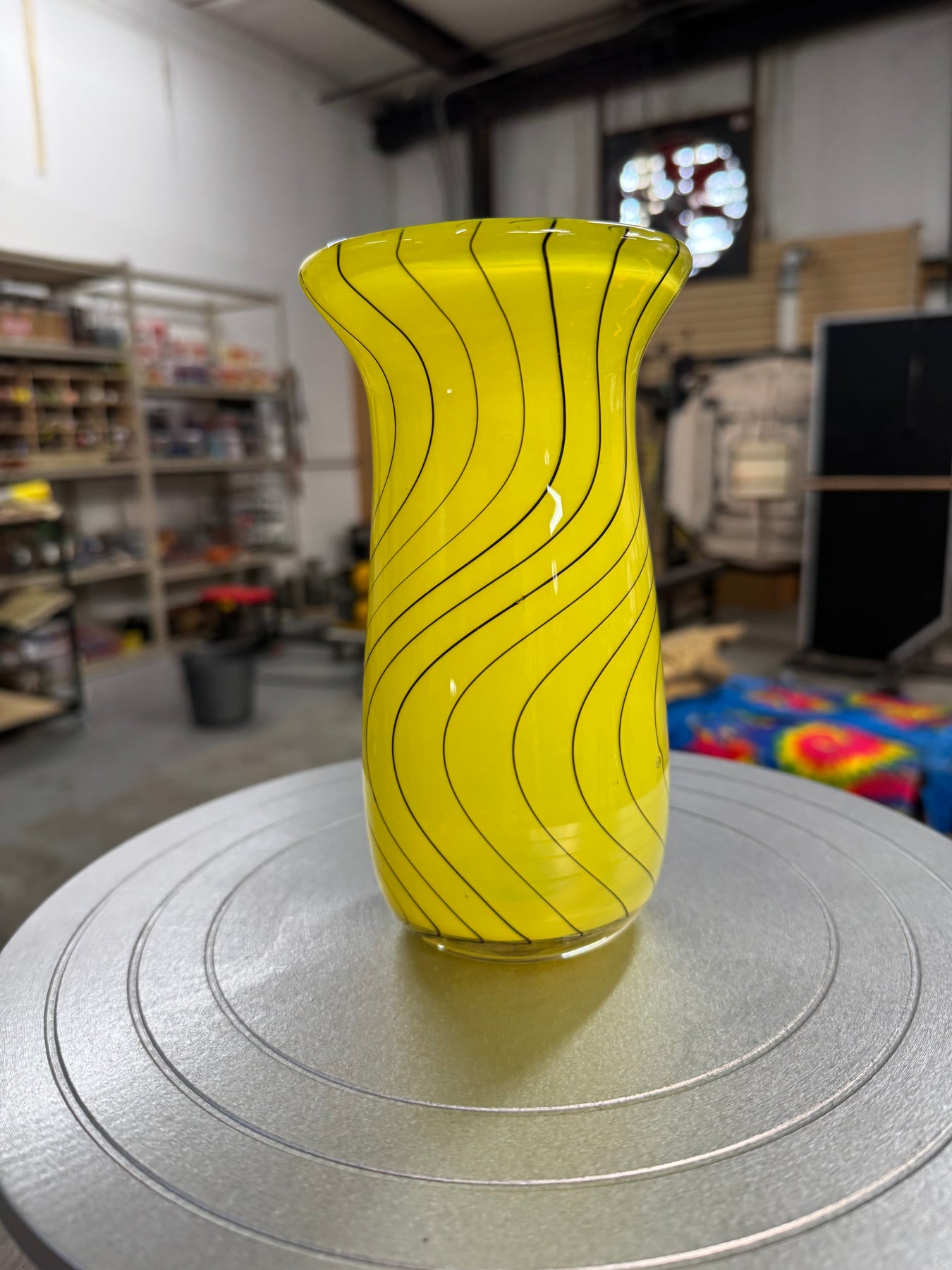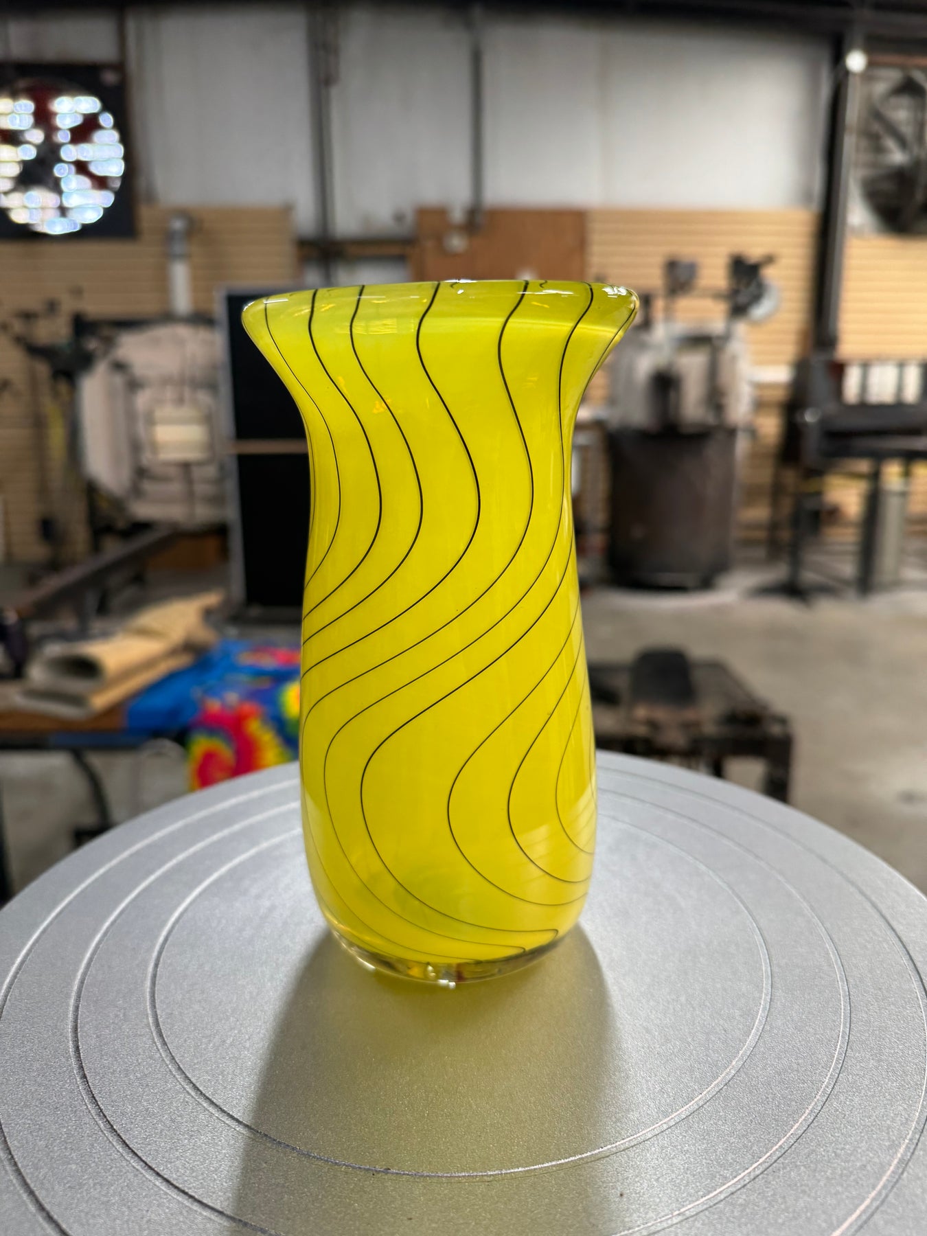 Large hand blown glass vase, yellow with hand pulled black cane in a wig wag pattern. ~ 7.5” x 3”
